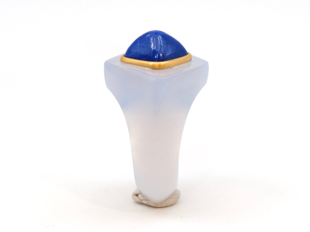 This special ring, designed by Scrives, is composed of a lapis lazuli sugarloaf cabochon. The lapis lazuli is set in 22cts gold and supported by a full ring of blue chalcedony.